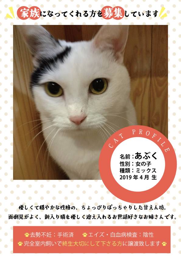 特に怪我も病気もなかったため、 検査後、 すぐに里親探しが始まり、 そのうちいいご縁があるだろうとおもっていたら今日に至りました。