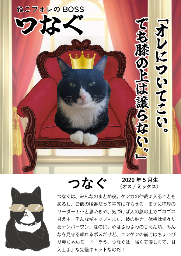 ほかの猫とも仲良く暮らせますが、とにかく甘えん坊さんなつなぐさんなので、愛情をたーっぷり注いでくださるおうちが最適です。